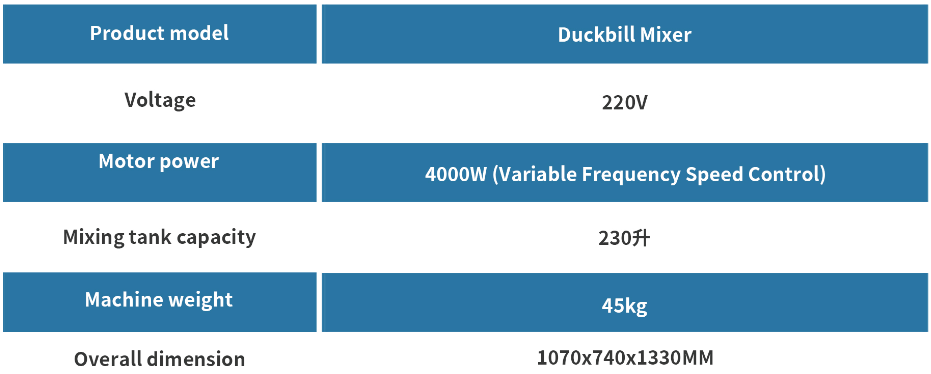 The Duck-Bill Mixer is a professional mixing equipment named for its mixing components or discharge structureresemblinga duck’s bill. It is suitable for mixing various materials such as coatings, mortars, and self-levelingmaterials. Its unique duck-bill design enables efficient mixing and precise discharging of materials,effectivelyreducing material residue and improving mixing uniformity. The equipment is made of high-quality materials,featuring corrosion resistance and easy cleaning. It meets the hygiene and usage standards of industries suchas chemical engineering and construction.